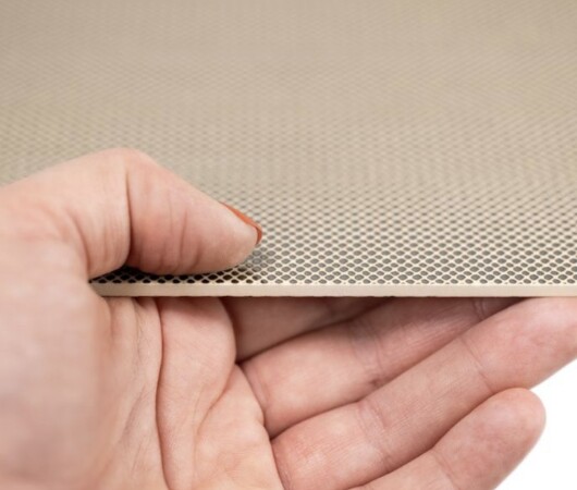 Die ressourcenschonende, keramische Platte „ist fast schon ein Klassiker der Branche, der ... nicht nur aufgrund seiner technischen Aspekte, sondern im Kontrast dazu durch seine metallisch schimmernde Eleganz“ beeindruckt. So die Jury des Materialpreis 2022.