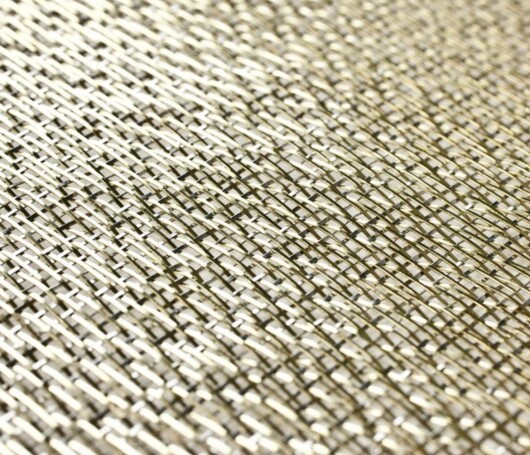 Mit einem Gewicht von nur 1,3 kg/m² und einer offenen Fläche von etwa 45 % sorgt das extravagante Köpergewebe aus drillierten Messing- und Edelstahldrähten für besonderen Glanz. Durch die Unregelmäßigkeit werden Transluzenz und Tiefe des Gewebes erhöht.